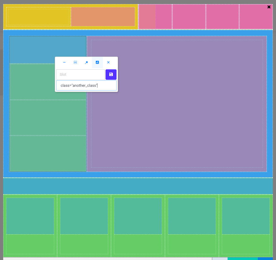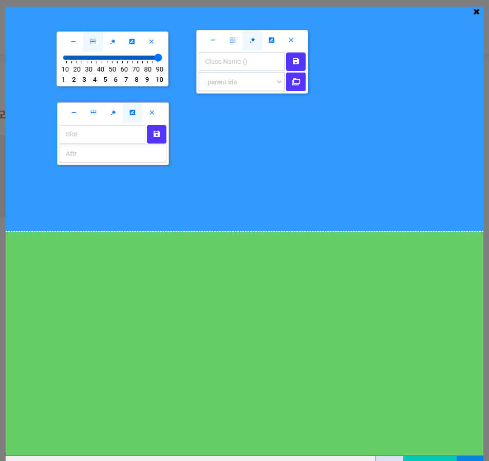 (-)삭제,()화면 제어,(.*)클래스 추가,()Slot 추가,(x)창 닫기 - 속성창: 클래스명 또는 Slot/Attribute 값을 입력할 수 있는 영역